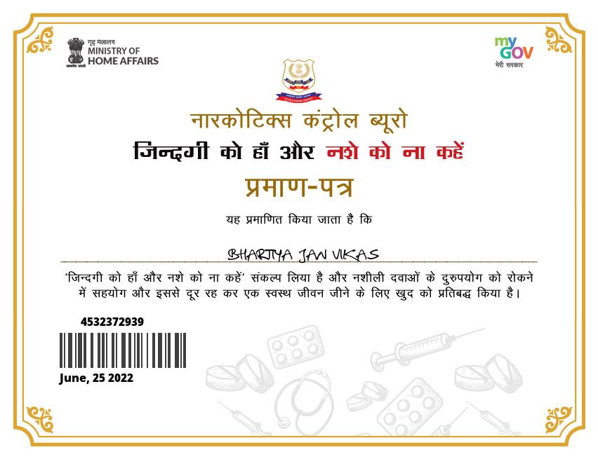 BJV received Narcotics control bureau certificate on 25.6.2022